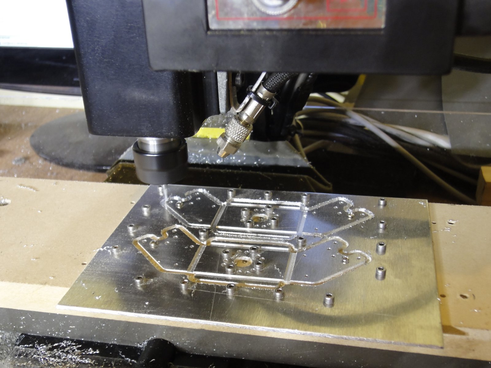 Primero empecé sujetando las planchas de aluminio sobre pequeñas placas de madera MDF, cortando con fresas de 3mm, una broca centro y varias brocas (1,6mm, 2,0mm, 2,05mm, 2,5mm y 2,6mm), después pasé a usar una fresa de 2.5mm para mejor acabado en los rebajes. Siguiendo el Manual de Fabricación de DARwIn-OP puse puntos de unión en los cortes finales de las piezas para que no se suelten. Después reemplacé el uso de una placa MDF de base por una de aluminio. Después probé fresar todo con sólo una fresa de 1.5mm, pero no me gustó el acabado y la calidad de los hoyos.