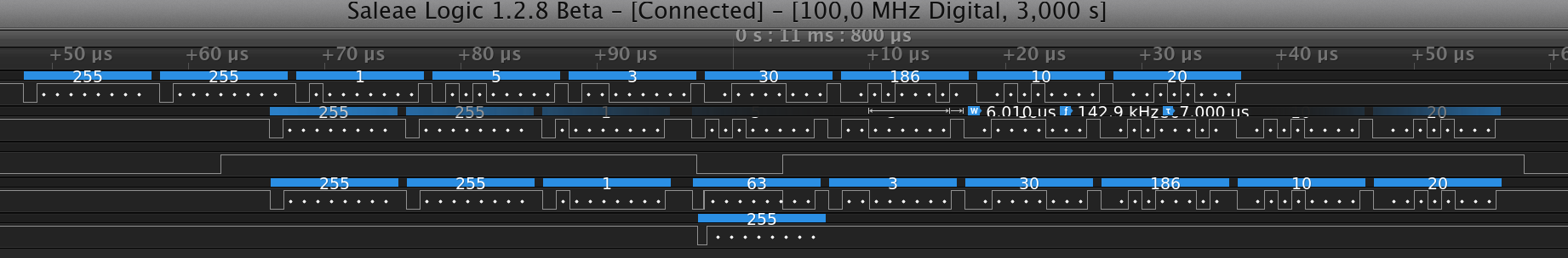 After stress testing, 1 in every 30 to 100 commands to the servo would result in a timeout waiting for the servo’s response. So after several attempts I captured some cases where the direction pin worked incorrectly.