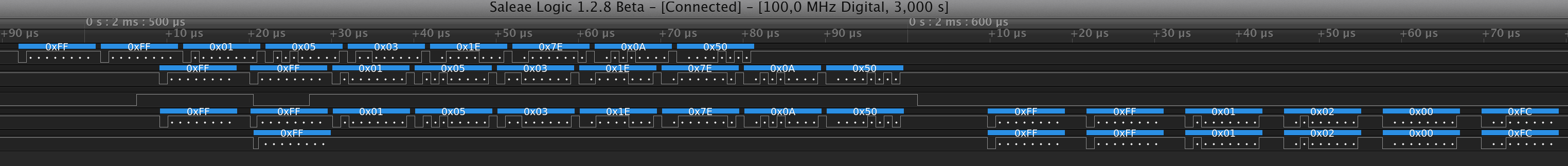 Normally, the direction pin works okay, but sometimes it would deactivate during transmission. Failure chart 1 shows a case that do not affect the message to the servo, but the Odroid receives back an extra initial 0xFF byte. Failure chart 2 shows a message being corrupted, the 4th byte in the Dynamixel bus has value 63 but should have value 5.