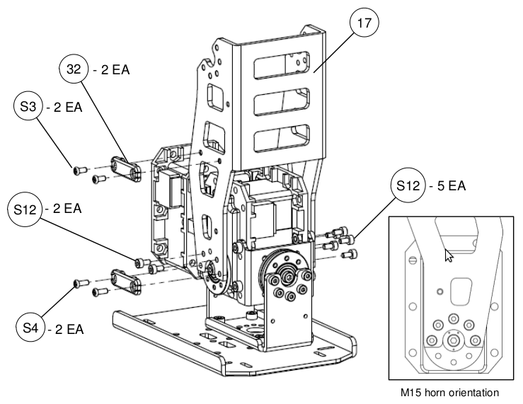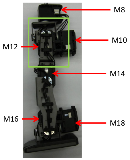 - Describe el proceso de ensamblado de los servos con las piezas y la placa madre. El ensamblado es hecho en partes (piernas, pecho, brazos) las que después se juntan. Hay que tener cuidado de ensamblar correctamente los servos, éstos tienen un disco motriz y a veces por el otro lado, un disco volante (con un rodamiento). Es necesario instalar los servos en la posición indicada, además el disco motriz tiene marcas que deben alinearse ya que el servo MX-28T tiene codificación absoluta de su posición (el software de control espera cierto valor para la posición de pie por ejemplo).