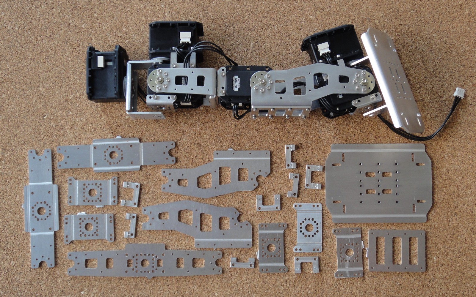 Cambié la pieza de de la ‘rodilla’, mi primera versión tenía un doblez en la parte baja, pero lo eliminé del diseño para permitir que mi clon de DARwIn-OP tenga el mismo rango de movimiento en las articulaciones que el robot original. También, mi primera tanda de piezas FR07-S101 tenían 4 agujeros faltantes (se ve en la foto, por suerte no son usados en el robot DARwIn-OP).
