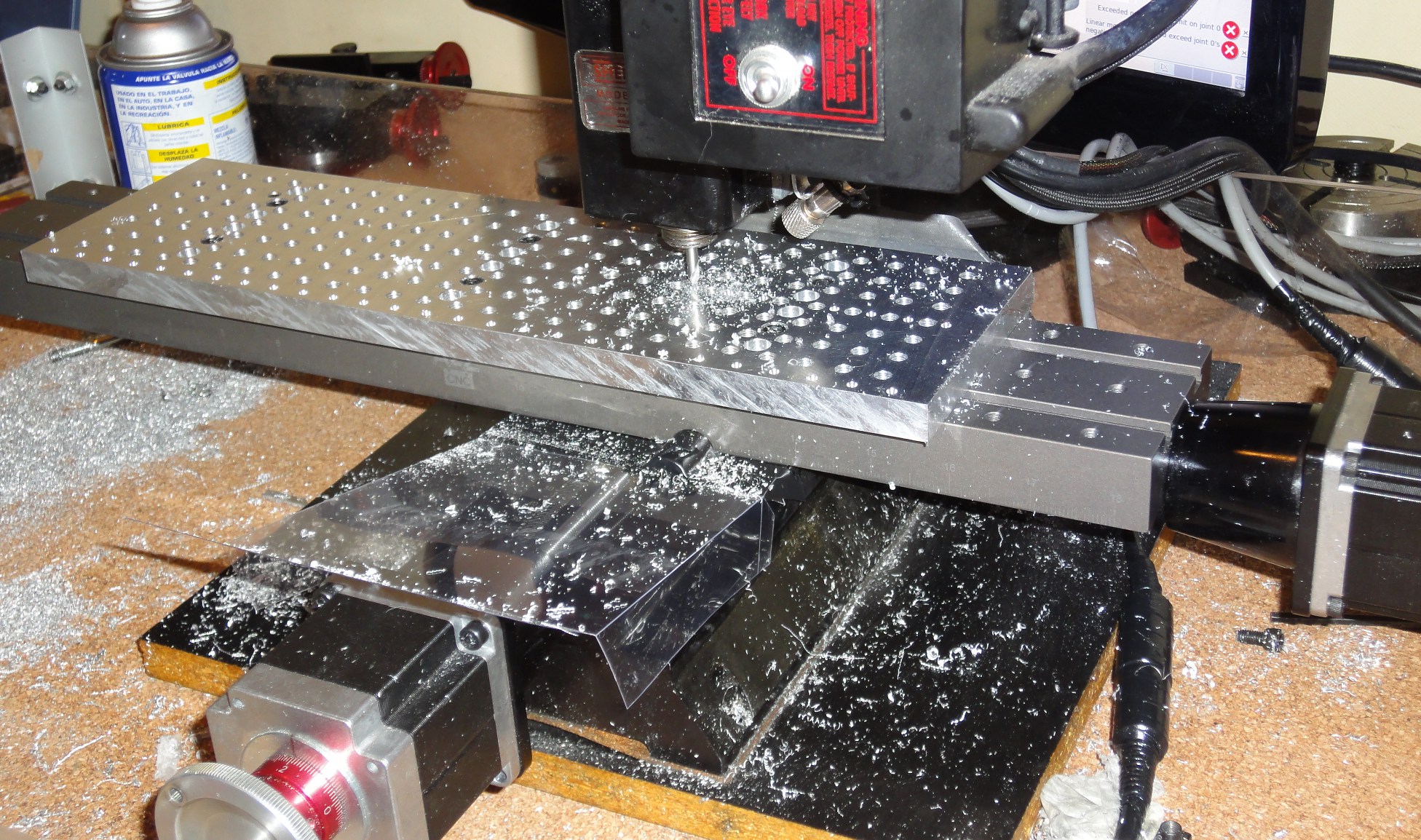 Decidí agrandar el eje X de mi fresadora Sherline con una tabla de 19″ de A2Z y una placa matriz de High Tech Systems de 14″. Sherline tiene una tabla extendida pero quise probar esta marca porque es un poco más alta y fresar las piezas para el robot DARwIn-OP es un trabajo de muy bajo perfil y las fresas son cortas. La placa matriz ayuda en altura y permite soportar un trabajo de 4″ de ancho.